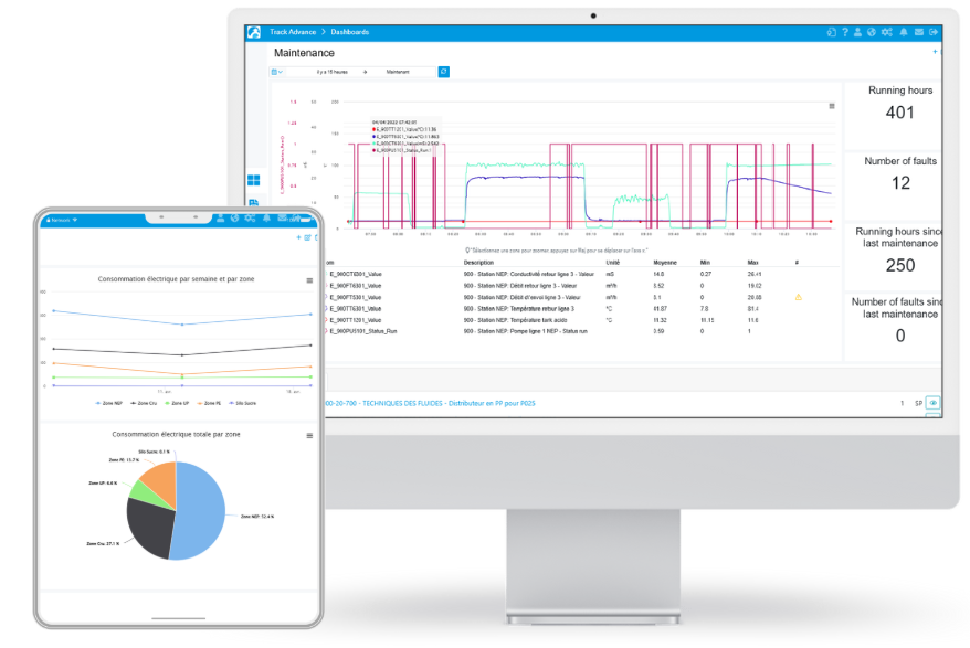 Track Advance agit sur les leviers de coûts majeurs. Energy facilite le suivi des utilités et les alertes de surconsommation pour déclencher des actions correctives. Maintenance anticipe les pannes via vibrations et thermique et planifie les pièces avec Smart Spare Parts. CIP & SIP contribue à réduire eau, vapeur et détergents. A long terme : moins de pertes et une performance durable.
